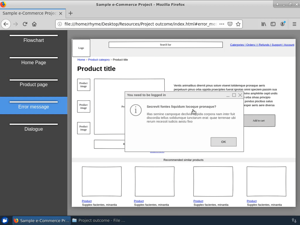 Wireframe an ecommerce home and product pages with dialogue and error messages