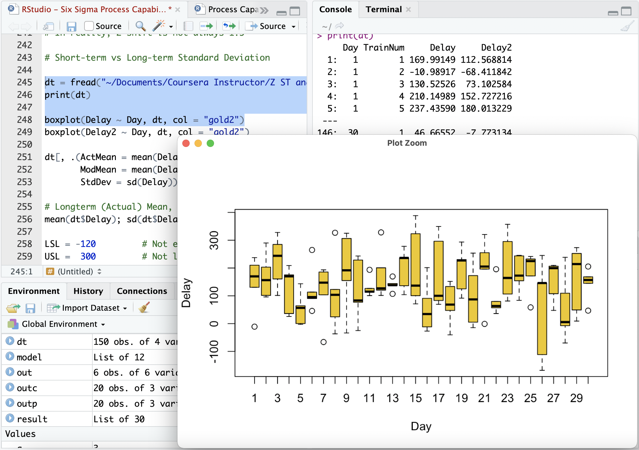 Introduction to RStudio environment; import data into RStudio and perform Process Capability Analysis.